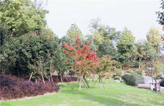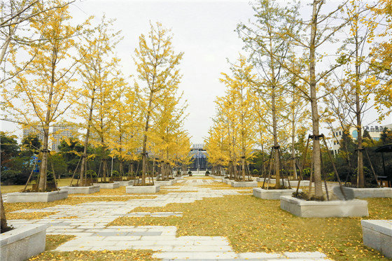 中心广场再往南,是一片疏林草地,通过微地形营造出开阔的空间。植物配置简洁大方,上层种植香樟、无患子、雪松等高大树木,中层种植桂花、鸡爪槭、红枫等观花和观叶植物,下层种植红花檵木、金叶大花六道木、八角金盘、海桐等,并将金叶女贞球、红叶石楠球等点缀其中,形成层次饱满、季相丰富的园林景观。特别是深秋时节,疏林草地依然是一片绿色,与不远处金黄的银杏树阵形成鲜明对比,营造出丰富的色彩感。