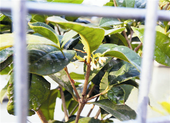 排捞站北侧,是一个矩形的江水垃圾过滤池。过滤池上方没有采用传统的硬质栏杆,而是创新性地用“桂花网片”进行围合,先在外围拉起1.2米高的铁丝网,再将同样高度的矮化四季桂和月季种植在铁丝网内侧,形成一圈绿篱,既可以充当护栏,又显得生态美观。