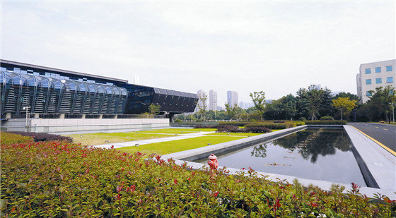 为与建筑风格相适应,整个园区的景观设计融合西式秩序与东方礼仪,整体中轴对称、局部细微变化,通过长方形的水体景观、大片开阔平坦的草坪、列植的树阵、规则式绿篱等,营造出和谐、大气、简洁、明快的景观风貌。